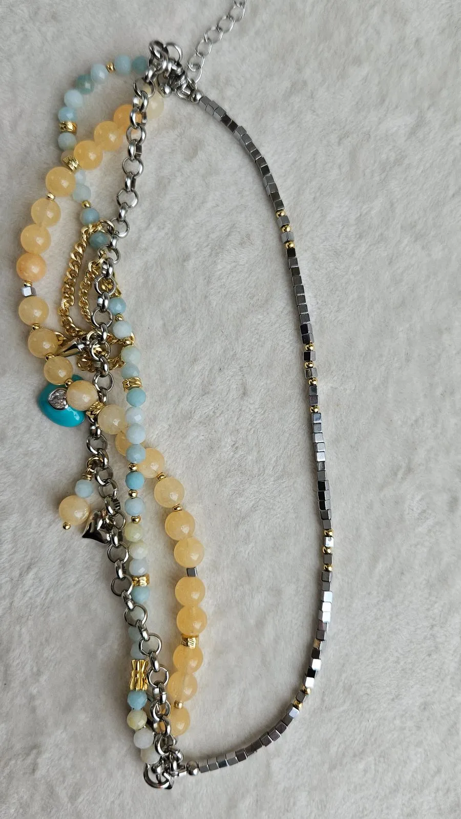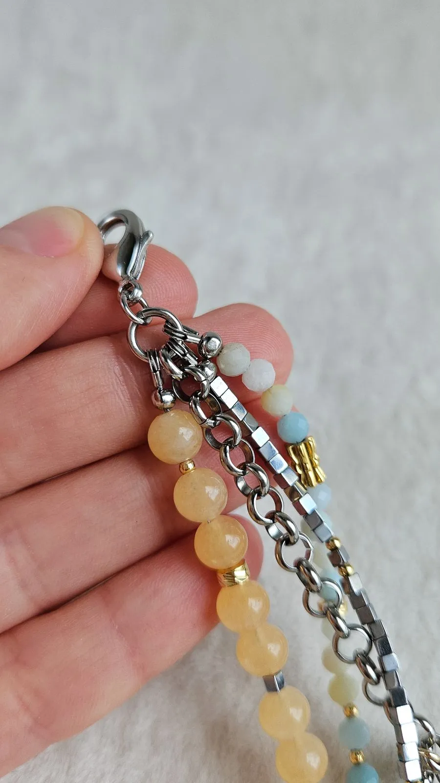 В отличие от обычного браслета, где все бусины нанизаны на одну нить, здесь мы создаём несколько независимых слоёв. В нашем примере их четыре: три нити из натуральных камней (амазонит, кварц, гематит) и четвёртый слой — цепочка с подвесками. Все они собираются на одном замке, но при этом остаются подвижными. За счёт этого браслет мягко обнимает запястье, слои слегка перекатываются друг относительно друга, а металлические подвески на цепочке добавляют приятное позвякивание.