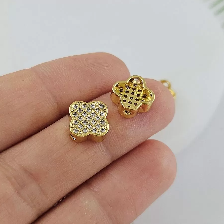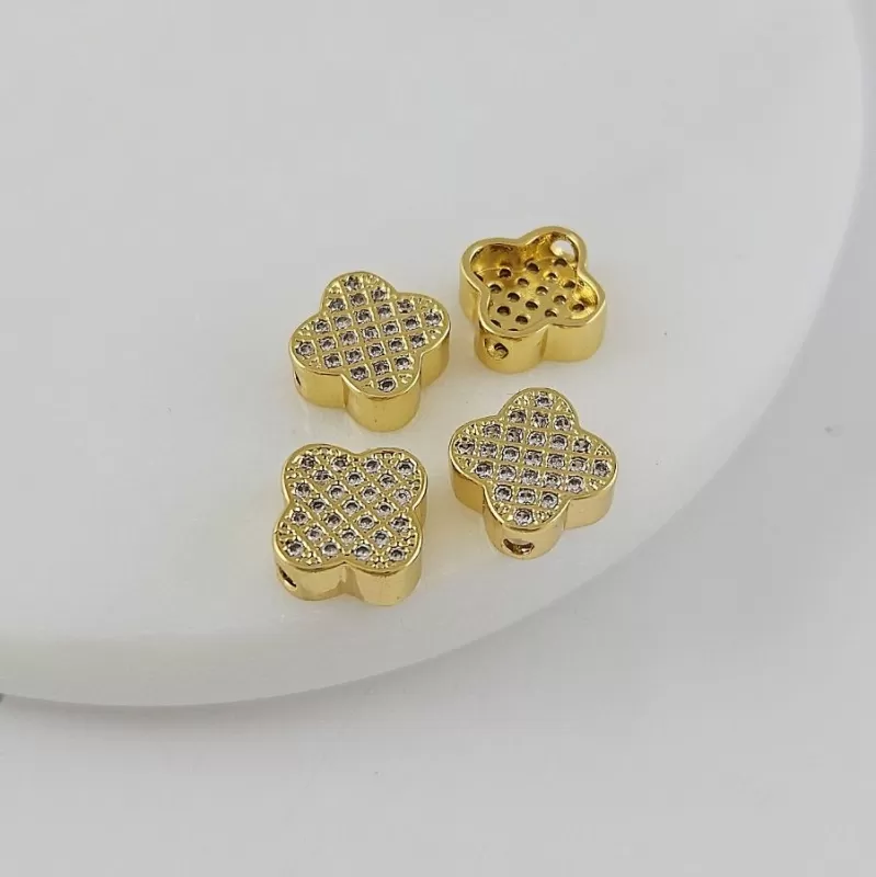 Бусина «Клевер» с фианитами, позолота 18К, 10.2×10.2×3.9 мм, латунь (арт. 9940-З)