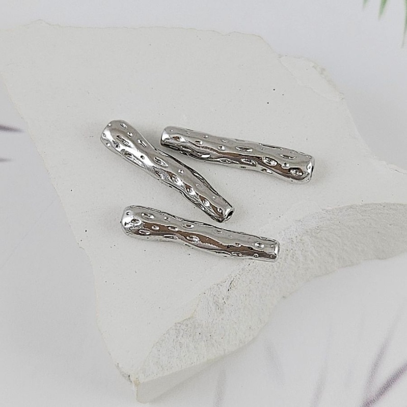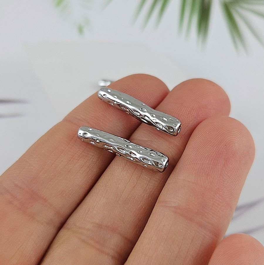 Удлинённая бусина-разделитель с выразительной рельефной текстурой словно вдохновлена формами природы — лёгкая, изогнутая, органическая. Выполнена из латуни с родиевым покрытием, придающим изделию элегантный серебристый блеск, защиту от потускнения и устойчивость к износу. Идеально подходит для использования в современных украшениях ручной работы.