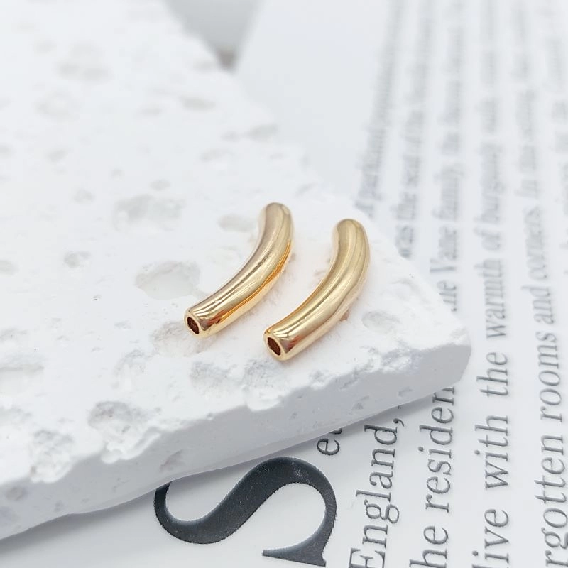 Форма трубочки с лёгким изгибом придаёт украшению плавность и динамичность, делая его визуально привлекательным. Бусина выполнена из латуни и имеет отверстие диаметром около 1 мм, идеально подходящее для шнуров, ювелирных лесок и тросиков.