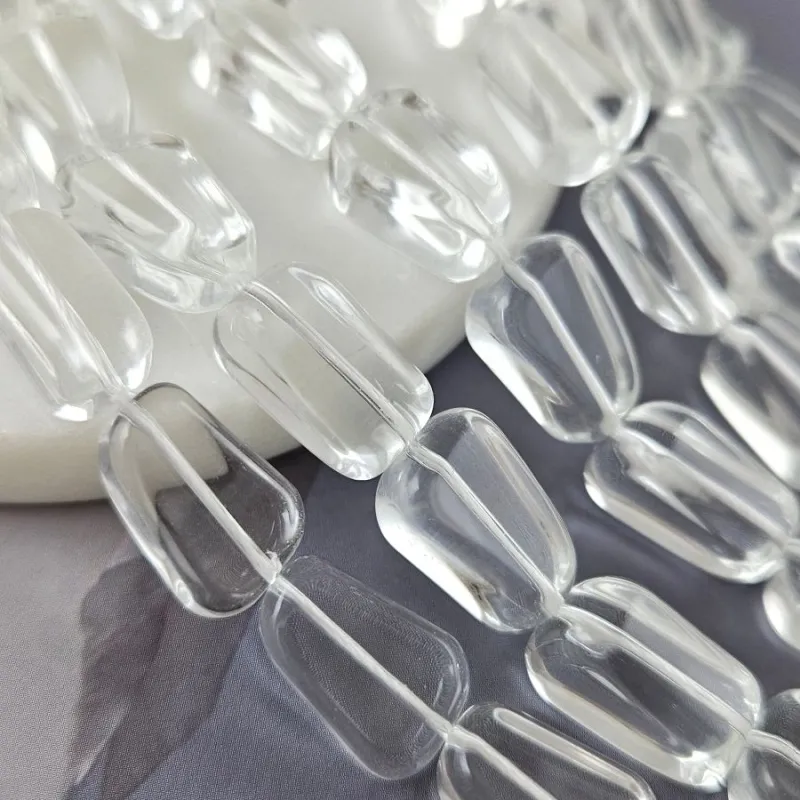 Прозрачное стекло с обтекаемой, немного вытянутой и асимметричной формой. Поверхность блестящая, с минимальными искажениями, что усиливает эффект чистоты и лёгкости. В зависимости от освещения бусина демонстрирует мягкую игру света и глубины, гармонично дополняя минималистичный и современный стиль.