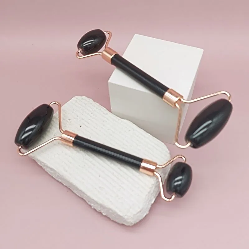 Массажер ролик 137x39-59 мм из черного обсидиана, металл латунь в цвет покрытия розовое золото (7758)