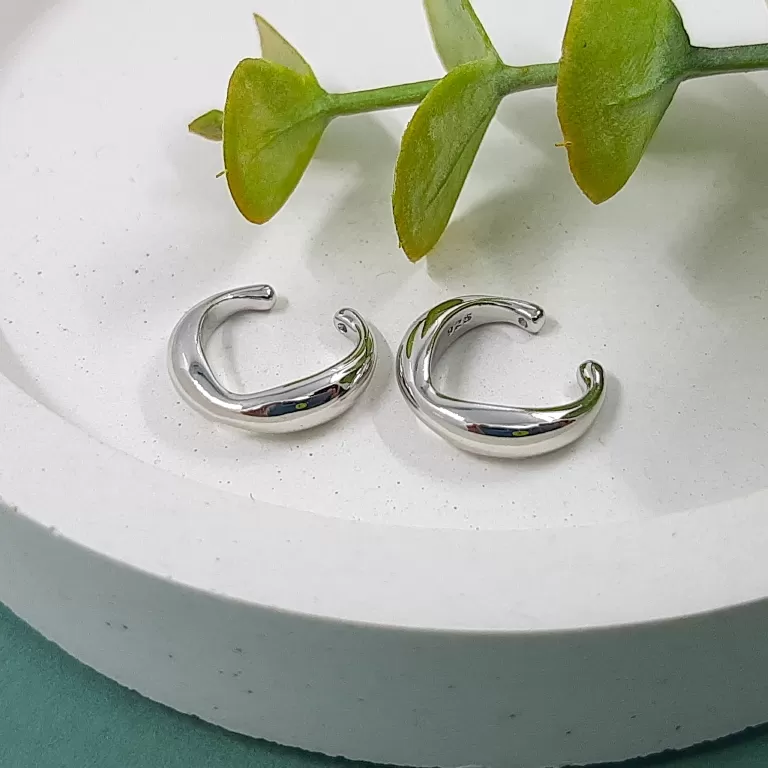 Кафф — элегантный и лаконичный аксессуар, который легко надеть без прокалывания уха. Изготовлен из латуни и покрыт родием — благородным металлом, придающим украшению сияющий серебристый блеск и повышенную стойкость к потускнению и царапинам.