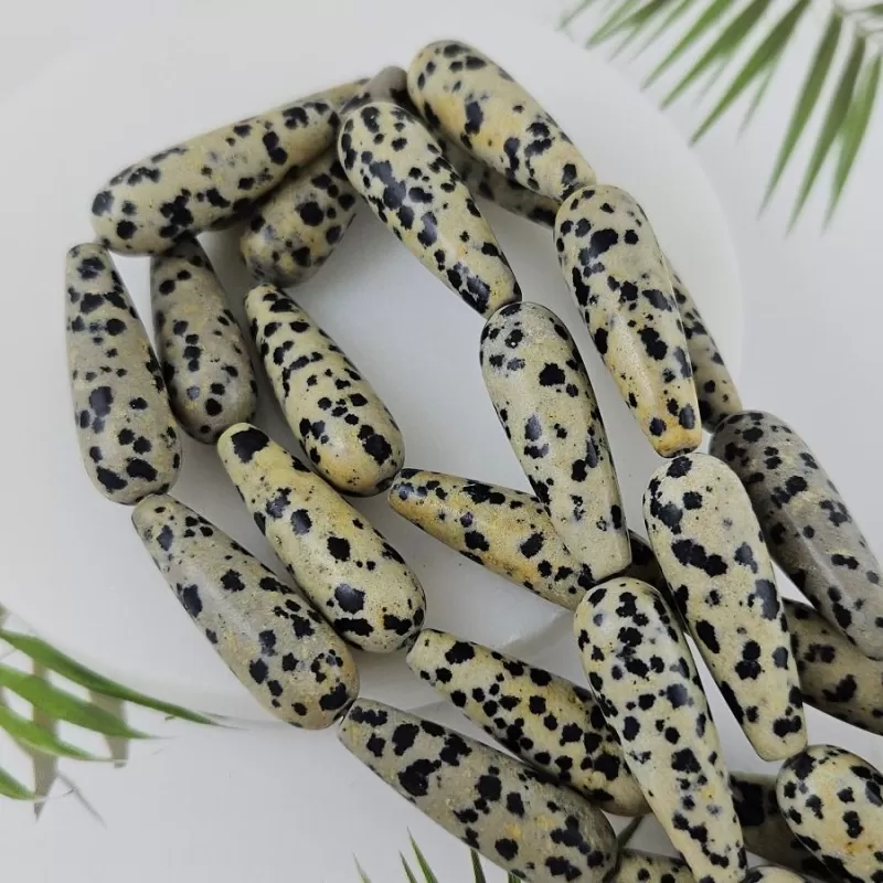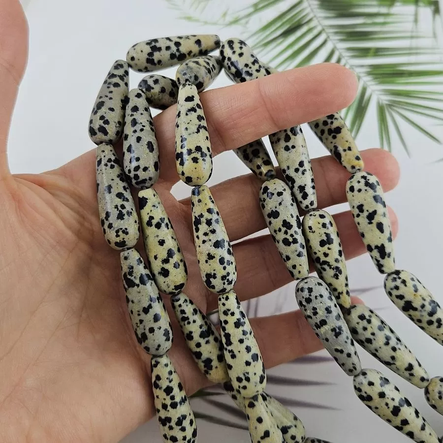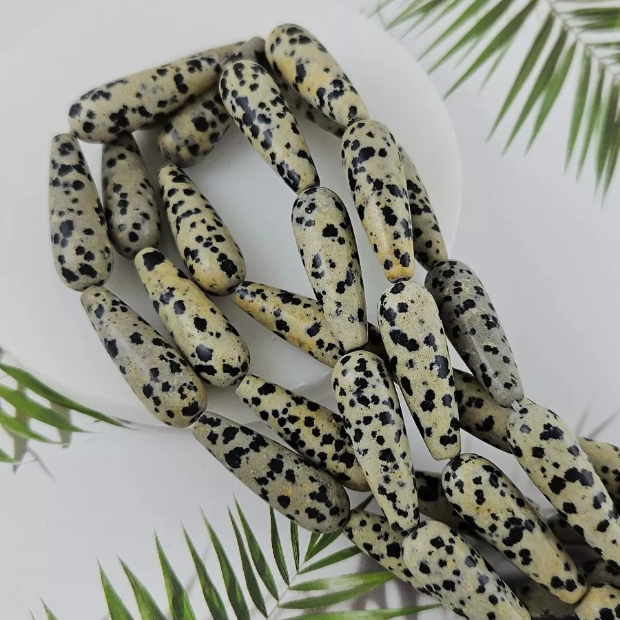 Яшма 9936-ЯШ — это необычная бусина из натуральной далматиновой яшмы, выполненная в форме вытянутой гладкой капли. Благодаря характерному пятнистому окрасу — бежево-песочной основе с чёрными вкраплениями — камень легко узнаваем и эффектен в декоративных композициях. Размер около 30×10 мм позволяет использовать бусину как самостоятельный акцент или в паре для крупных украшений.