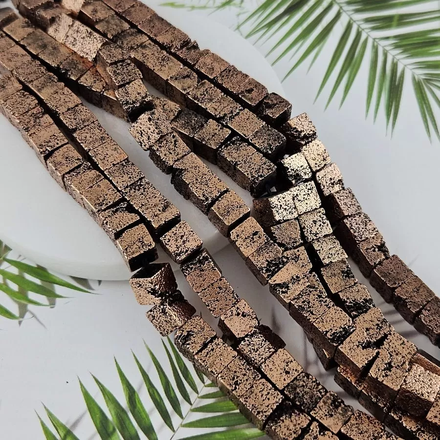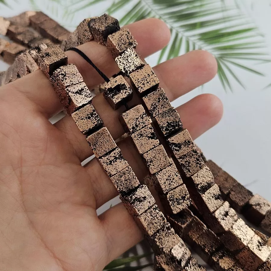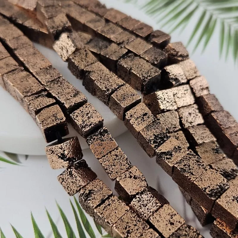 Бусины из лавы с гальваническим покрытием (арт. 9941) — эффектные элементы в форме куба, отлично подходящие для создания украшений с характером. Покрытие в медном металлизированном оттенке придаёт натуральной вулканической породе стильный индустриальный блеск. Пористая, естественная структура лавы сочетает природную фактуру и современное сияние металла, делая каждую бусину уникальной.