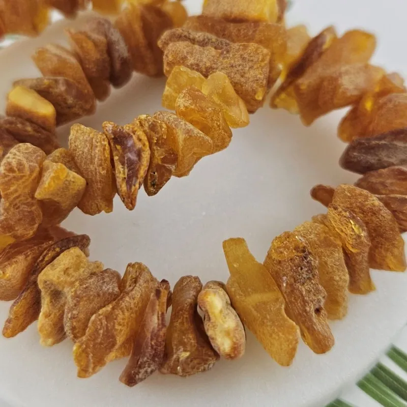 Бусины сохранили естественную, необработанную форму, что придаёт им особый шарм. Тёплые медовые и золотисто-коричневые оттенки натурального янтаря создают неповторимую игру света. Нешлифованная поверхность подчёркивает природное происхождение материала и делает каждое изделие уникальным.