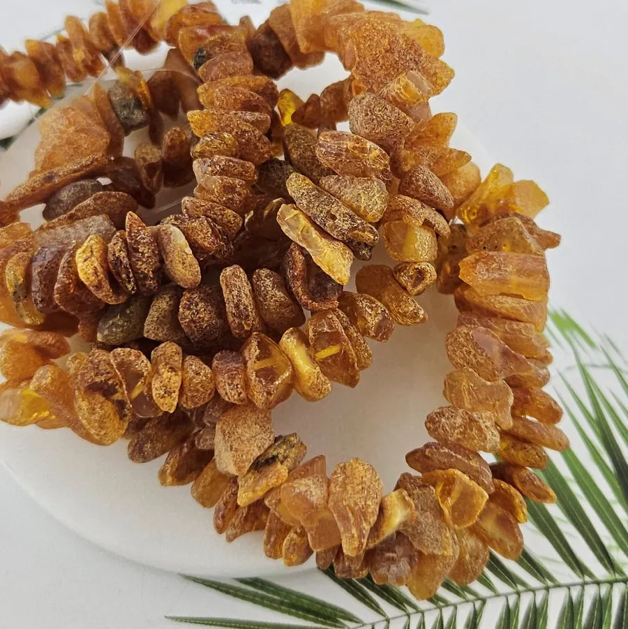 Бусины сохранили первозданную, необработанную форму, что придаёт им особый шарм и уникальность. Тёплые медово-золотистые оттенки янтаря создают красивую игру света. Нешлифованная поверхность подчёркивает природное происхождение материала, делая каждое изделие неповторимым.