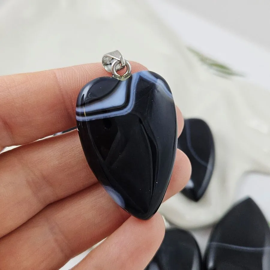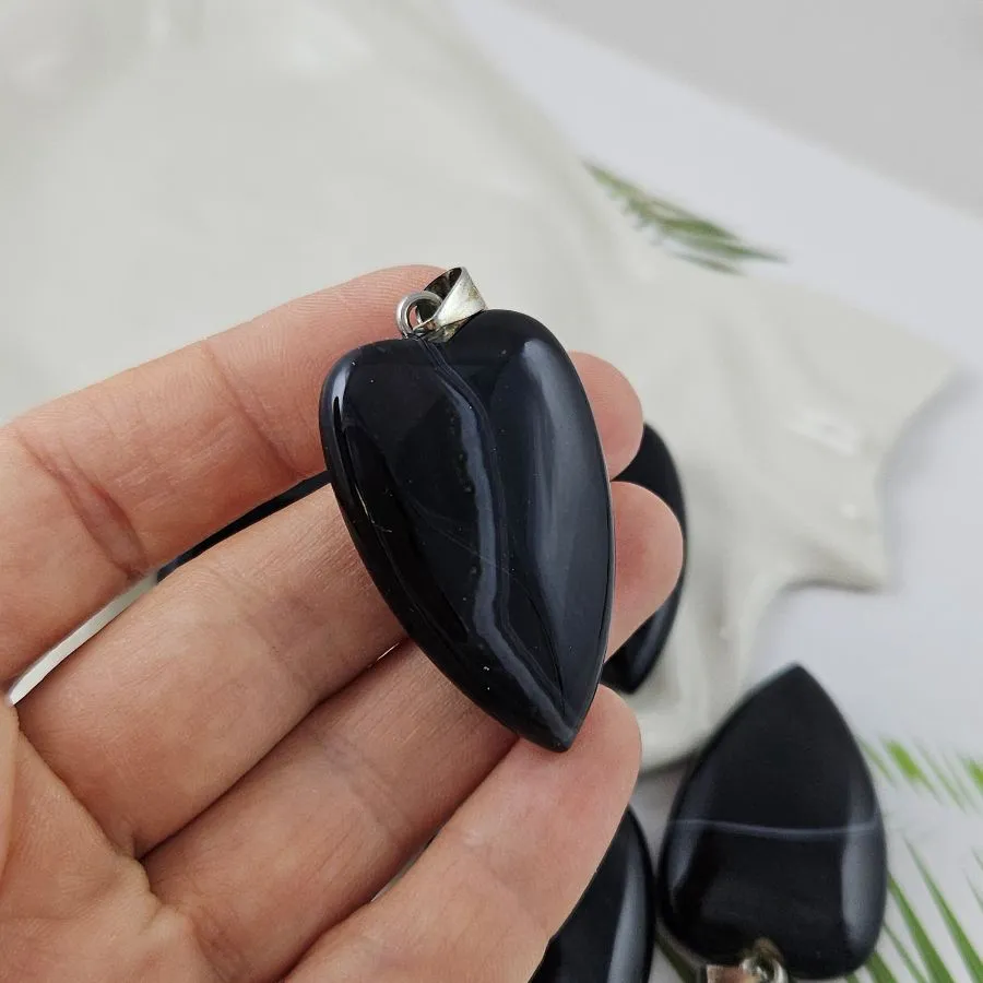 Оригинальная подвеска в форме удлинённого сердца из натурального черного агата с металлической фурнитурой в цвете платины. Каждый камень имеет свою природную структуру — встречаются экземпляры с полосками, прозрачными прожилками, коричневатыми или серыми участками, что характерно для природного агата. Поверхность хорошо отполирована, с благородным глянцем.