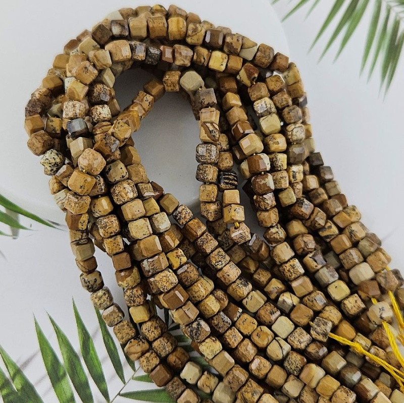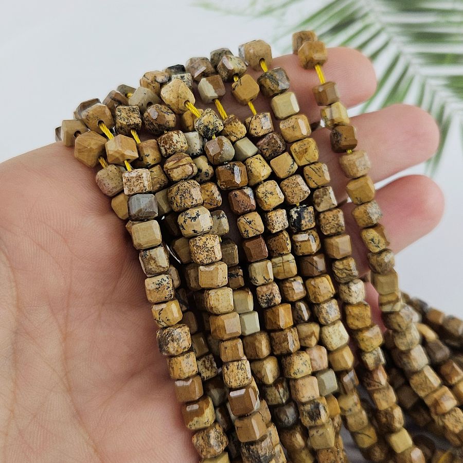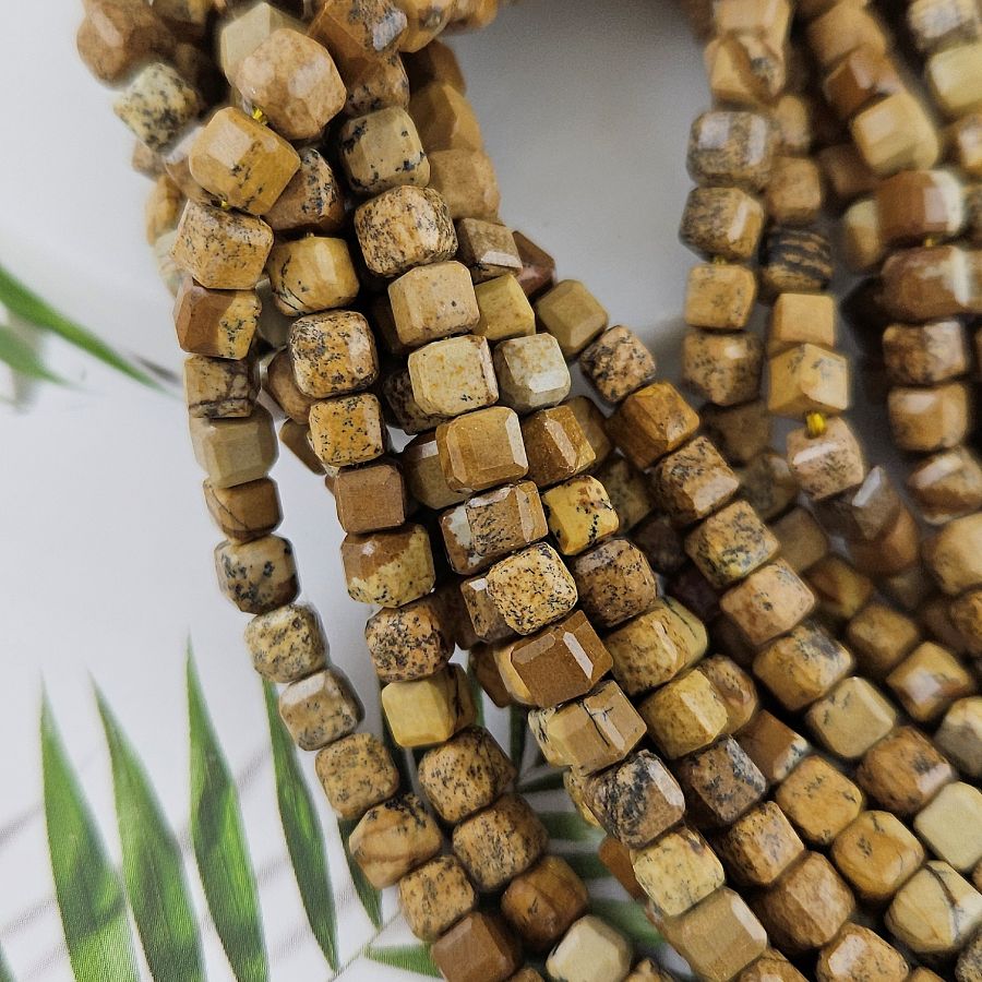 Нить 14,5 см, Яшма пейзажная 4,5–5 мм, бусины гранёный куб, отверстие ок. 1 мм (арт. 9939-ЯШ)