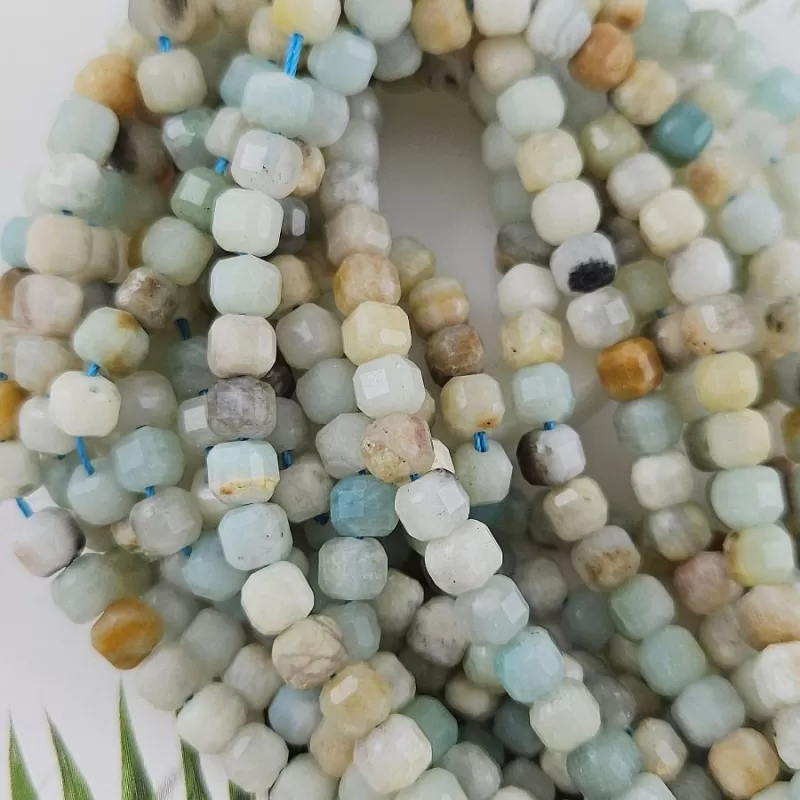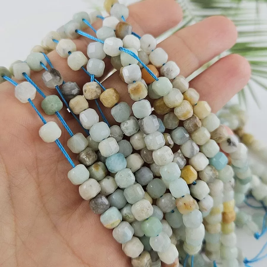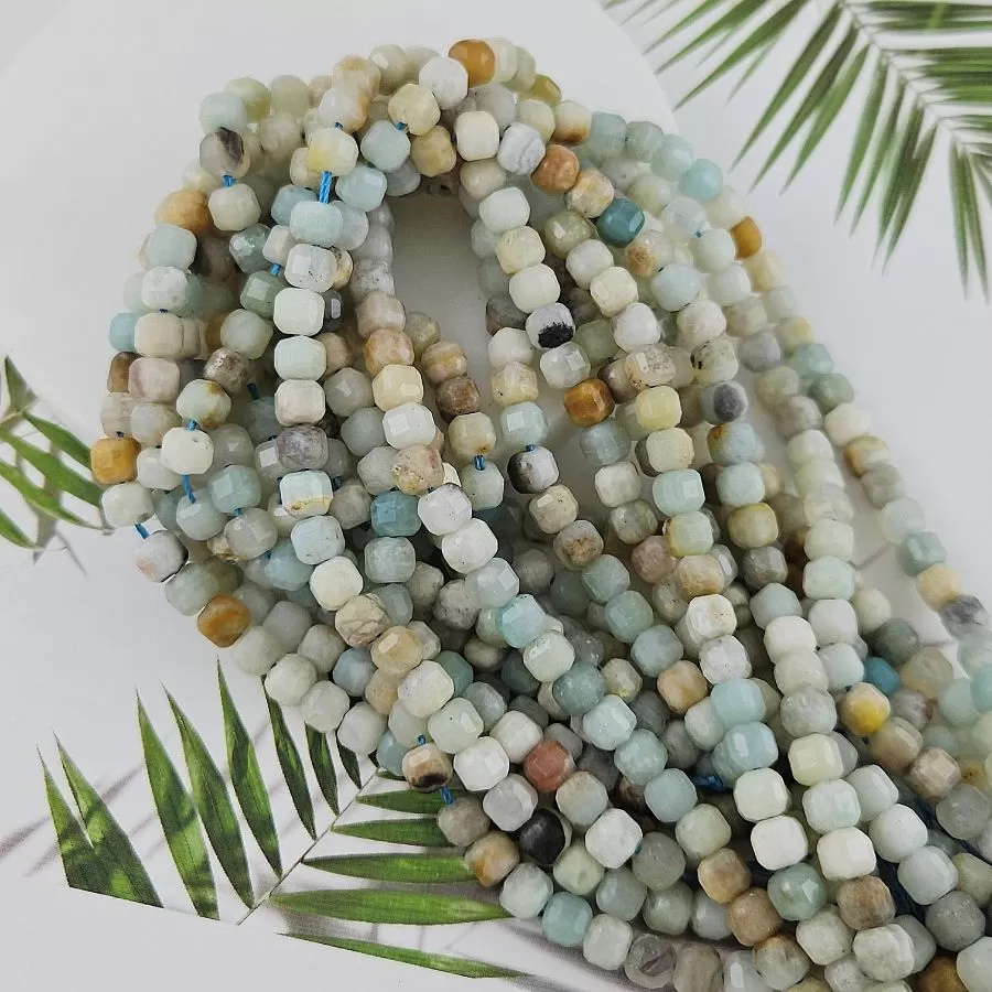 Амазонит 9939-АМ — это нить из натурального камня в спокойных природных тонах: зелёно-голубых, серовато-бирюзовых, бежевых и молочных оттенков. Каждая бусина выполнена в форме гранёного куба, что придаёт изделиям современную геометрию и неброский блеск. Камень мягко переливается при движении, подчёркивая живую структуру минерала. Длина нити — около 16 см, размер бусин — 5–6 мм.