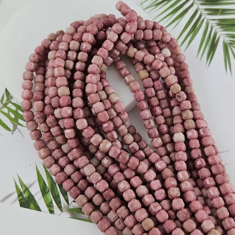 Родонит 9939-РОД — изысканная нить из натурального родонита с огранёнными бусинами в форме аккуратных кубиков. Камень представлен в мягкой, благородной розово-пыльной гамме с характерными включениями. Размер бусин — 5–6 мм. Кубическая форма и многогранная шлифовка придают бусинам выразительный блеск, а глубокий природный цвет делает родонит незаменимым материалом для женственных, элегантных и романтичных украшений. Длина нити — около 16 см.