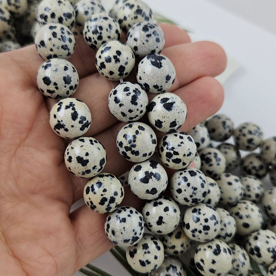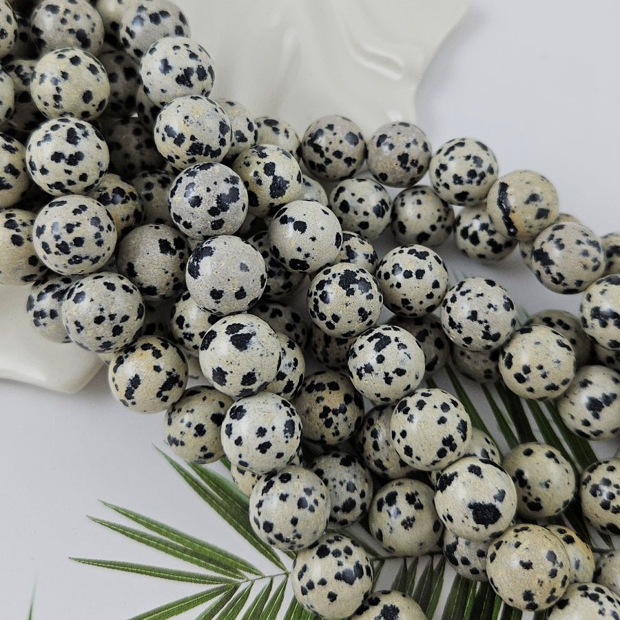 Яшма далматиновая (порфирит) — натуральный камень с характерным пятнистым узором. Контрастные чёрные включения на кремово-сером или бежевом фоне напоминают окрас далматина, за что минерал и получил своё название. Бусины крупного диаметра — около 12.5 мм — станут ярким акцентом в украшении и придадут изделию весомость и оригинальность.