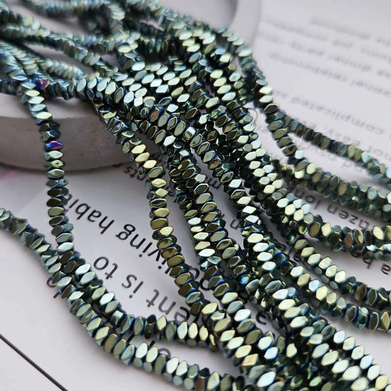 Нить 19-20 см Гематит 3х1.6 мм граненый квадрат, цвет зеленый (8693)
