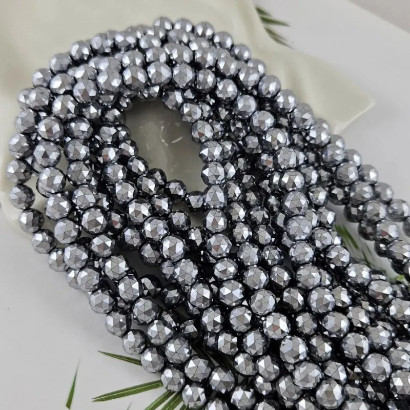 Гранёные бусины с зеркальной поверхностью создают завораживающую игру бликов, напоминающую огранённые драгоценные камни. Платиновый цвет выглядит благородно и стильно, отлично сочетается с другими материалами — от матового бисера до глянцевых вставок. Ювелирная огранка придаёт украшению премиальный вид, а крупный размер бусин делает изделие заметным и выразительным.
