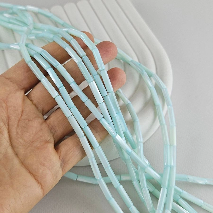 Эти бусины из натурального перламутра в форме изящных трубочек завораживают нежным голубым оттенком, напоминающим отблески океана под лучами солнца. Их природный блеск и лёгкие переливы создадут эффект свежести и элегантности в любом проекте — от серёг до многослойных колье.