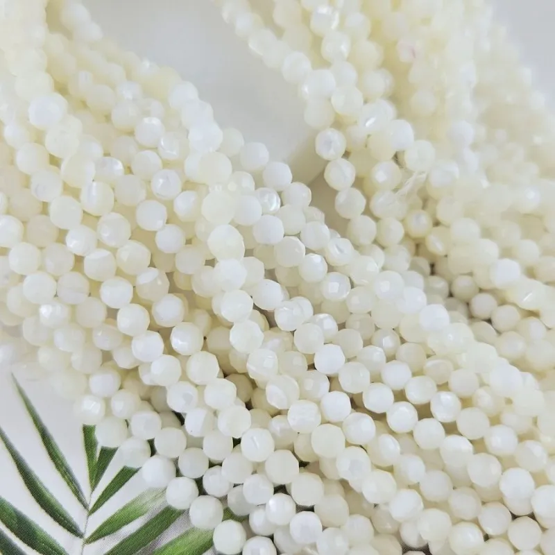 Мелкие грани на поверхности бусин придают им изысканный блеск, подчёркивая естественную игру света на перламутре. Цвет — мягкий, молочный с перламутровыми переливами. Благодаря компактному размеру, бусины выглядят элегантно и деликатно, прекрасно подходят как для самостоятельного минималистичного украшения, так и в качестве дополнения к сложным композициям.