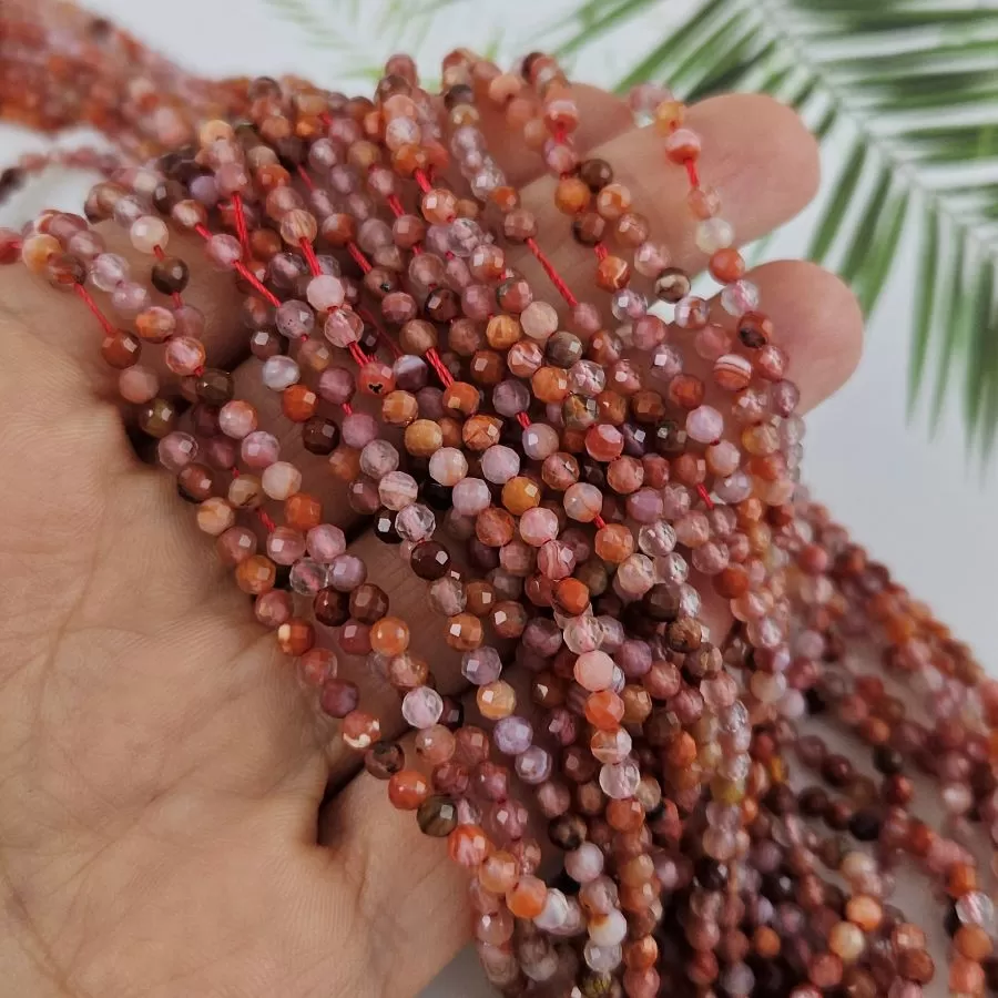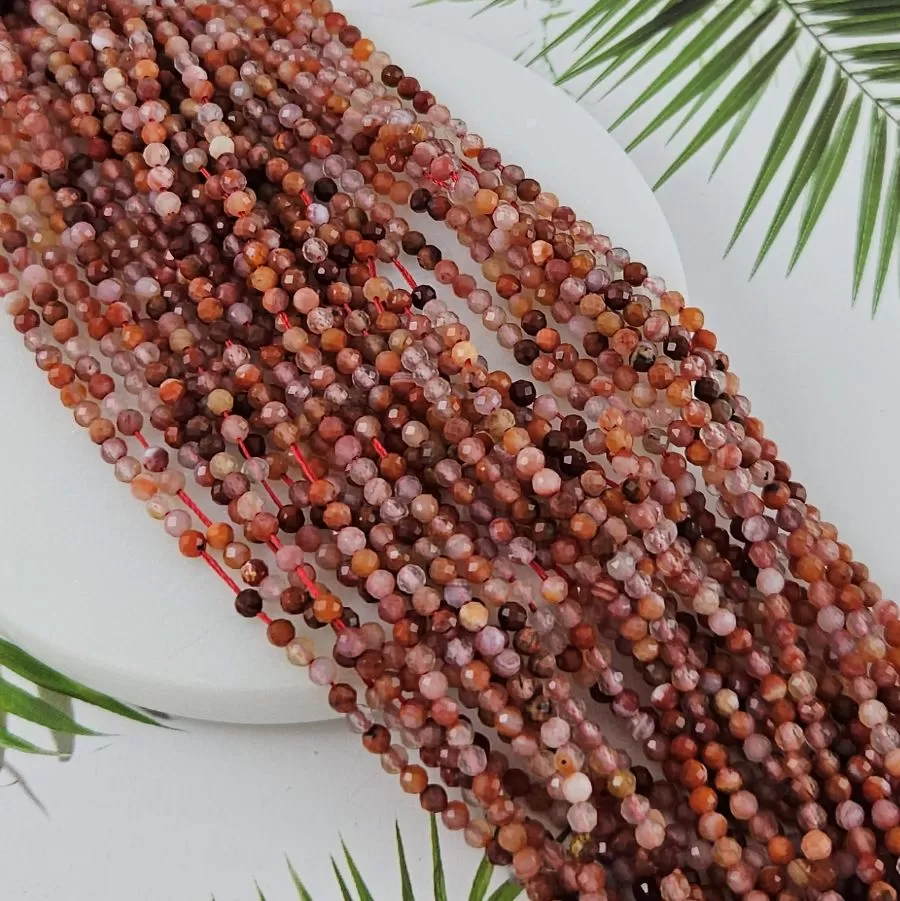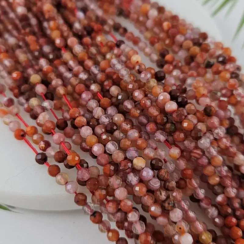Агат красный 9938 — изящная нить с мелкими бусинами из натурального агата, аккуратно огранёнными по кругу. Размер бусин — всего 3 мм, что делает их идеальными для утончённых и миниатюрных украшений. Микс тёплых оттенков красного, терракотового, кирпичного и бордового создаёт эффект живого движения и глубины. Каждая бусинка сияет небольшими гранями, подчёркивая структуру камня. Длина нити — около 38 см.