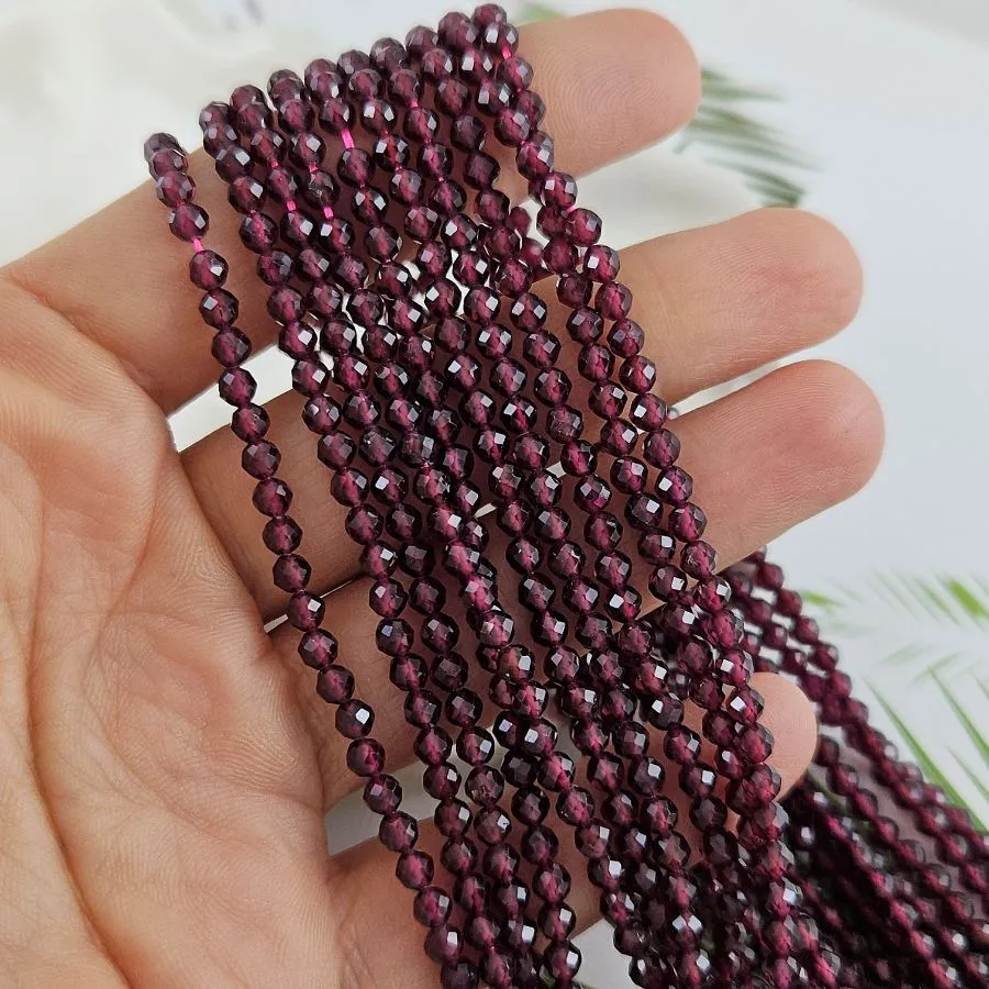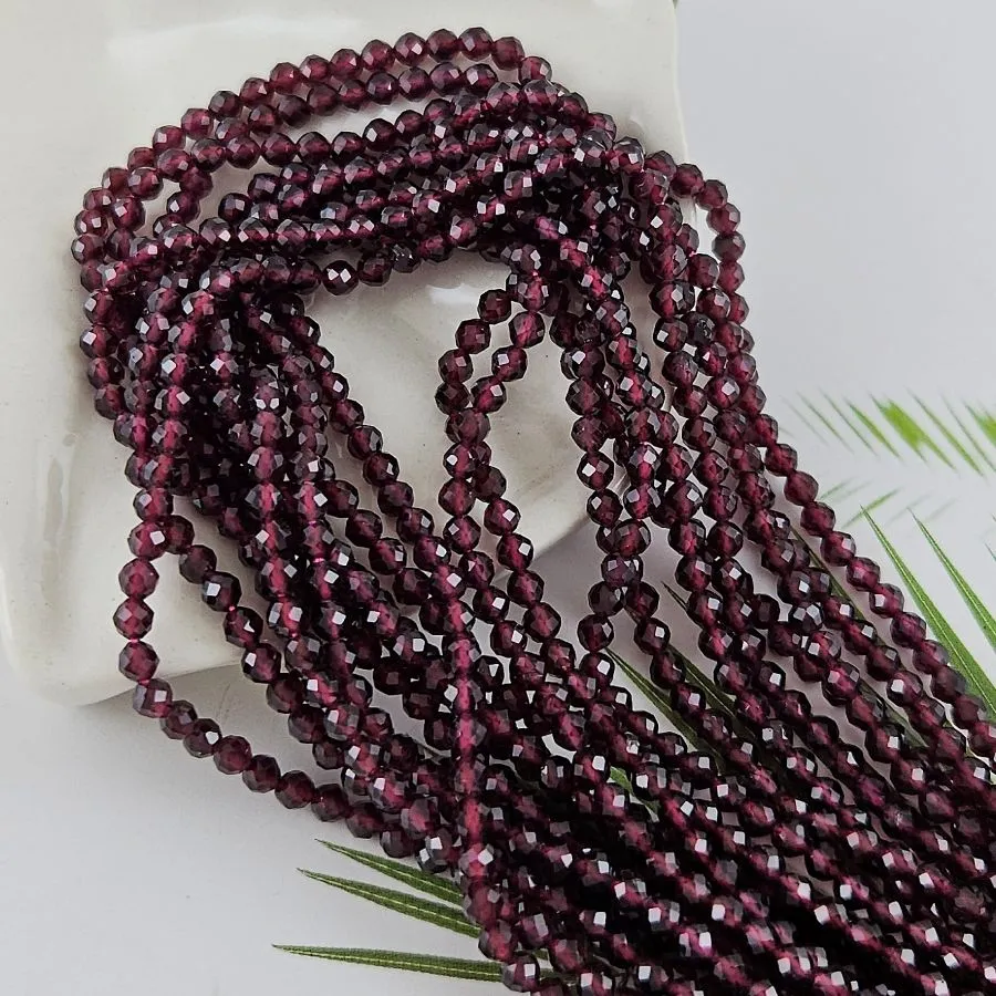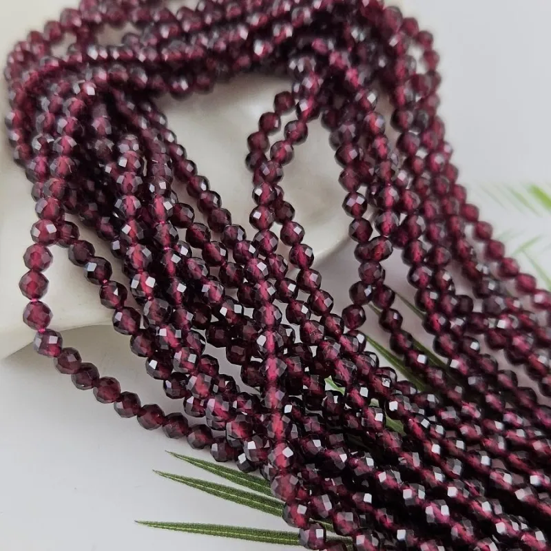 Нить натуральных гранёных бусин пиропа (разновидность граната) — изысканный материал для создания украшений. Длина нити — 38 см, размер бусин около 3,4 мм, диаметр отверстия — около 0,5 мм. Гранёная форма бусин придаёт изделию особый блеск и выразительность.
