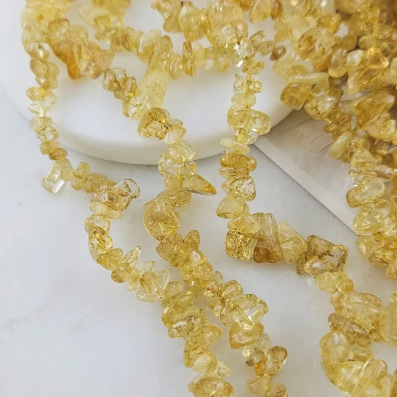 Тонированный и гретый цитрин в форме каменной крошки размером около 5–11 мм — это яркий и тёплый акцент для создания солнечных и позитивных украшений. Натуральный кварц, прошедший термическую обработку, приобретает насыщенный золотисто-медовый оттенок с лёгким стеклянным блеском. Бусины имеют неровную крошечную форму, сохраняя естественную структуру каждого камня. Нанизаны на прочную основу с отверстием около 1 мм, что удобно для большинства видов фурнитуры.