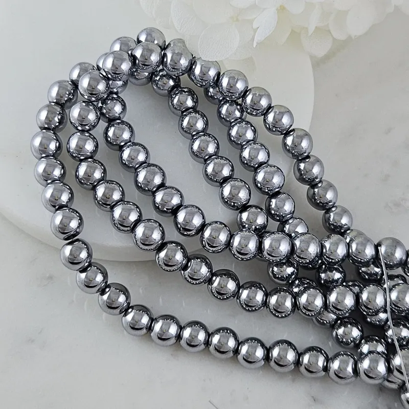 Нить с гладкими гематитовыми бусинами диаметром 8 мм добавит изысканности и современности вашим украшениям. Платиновое покрытие придаёт бусинам яркий блеск.