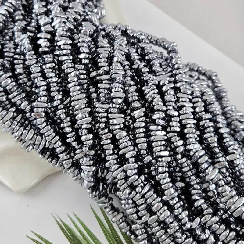 Изящная нить бусин фри-форм из гематина — износостойкого материала, имитирующего натуральный гематит. Длина нити около 39 см. Бусины отличаются необычной органичной формой, напоминающей природные самородки. Металлический блеск платинового оттенка придаёт украшению современный и элегантный вид. Идеальный выбор для создания стильных браслетов, колье, серёжек и других аксессуаров.