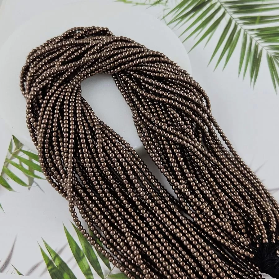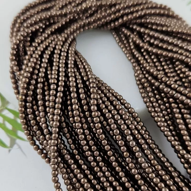 Бусины из гематина (арт. 9943-2) диаметром около 2.5 мм — это идеальный выбор для тех, кто ищет деликатные, универсальные элементы для тонких и аккуратных украшений. Выполненные в классической гладкой круглой форме, они создают ровную, плотную фактуру и при этом сохраняют благородный металлический коричневый блеск, характерный для гематита.