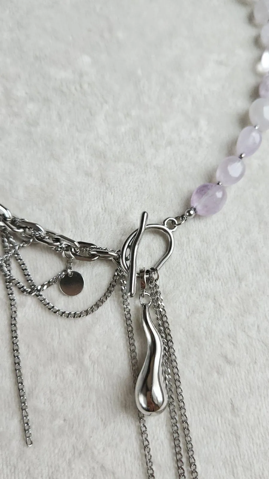 Набор Aura создан для тех, кто ценит утончённость, минимализм и благородство натуральных материалов. Аметистовые бусины в нежном лавандовом оттенке гармонично сочетаются с цепями и фурнитурой цвета холодного серебра, создавая стильное и выразительное колье.