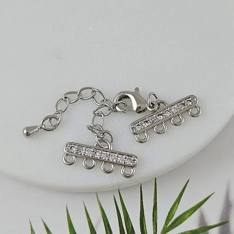 Роскошный комплект коннекторов на 4 нити с инкрустацией фианитами — это стильное и функциональное решение для создания многорядных украшений: браслетов, колье, чокеров и цепочек. Все элементы украшены блестящим родиевым покрытием, которое придаёт благородный серебристый оттенок, защищает от окисления и сохраняет устойчивый блеск.