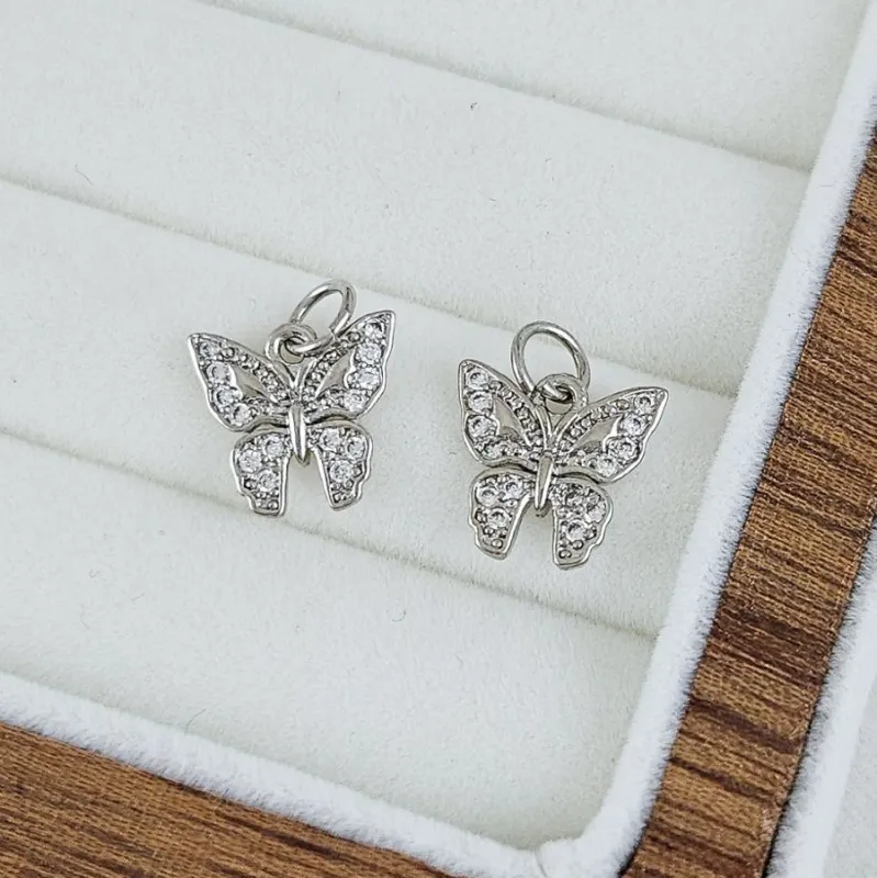 Изящная подвеска в форме бабочки из латуни с родиевым покрытием, украшенная сверкающими фианитами. Размер 10,5×11 мм. Ажурные крылья и россыпь мелких камней создают лёгкий, живой образ. Холодный блеск родия подчёркивает нежность формы, делая эту подвеску универсальным выбором для современных и романтичных украшений.