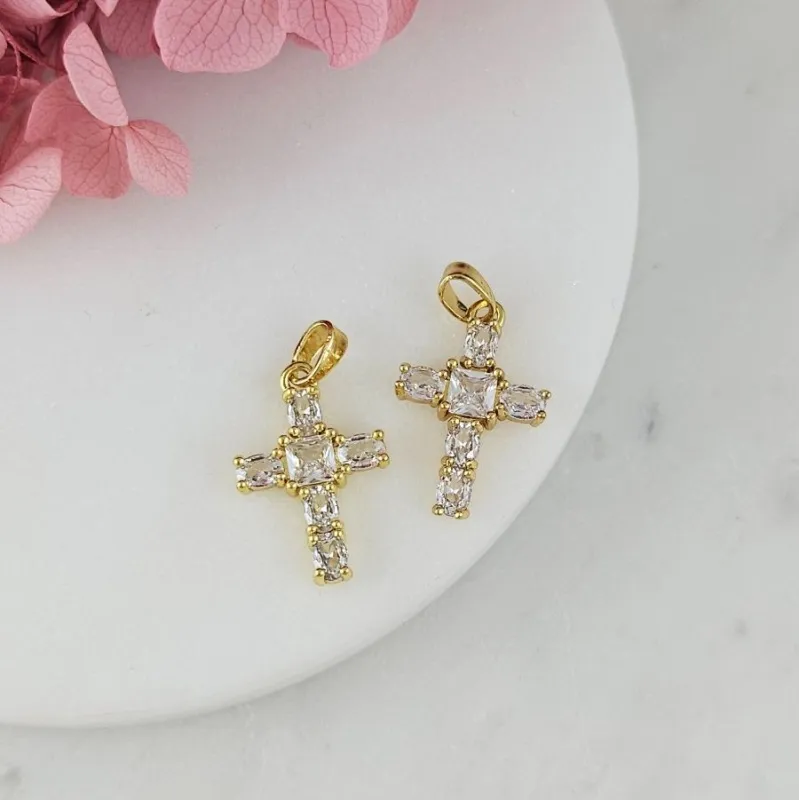 Подвеска-крест 20×13×3.3 мм с фианитами, позолота 18К (арт. 10207-БЗ) — латунь, прозрачные фианиты, компактный размер для любых сочетаний.
