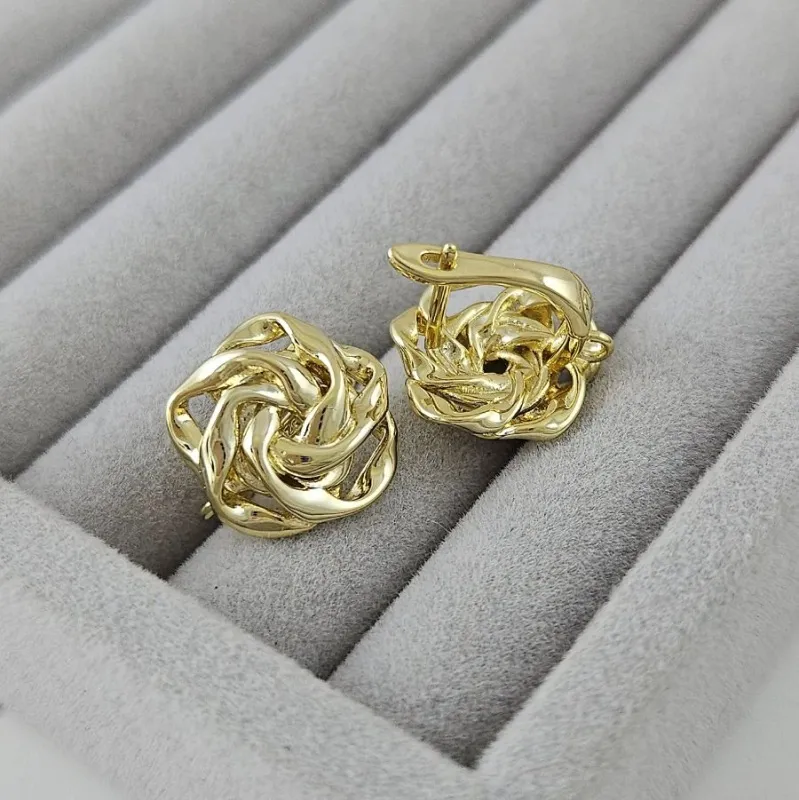 Эффектные швензы с английским замком выполнены из латуни и покрыты слоем позолоты 14К, придающим теплый благородный блеск. Изделие имеет изящную форму узла и зеркальную полировку, а надёжная застёжка обеспечивает комфорт при носке. Размер, указанный с учётом петельки: 16.5х15.5 мм.