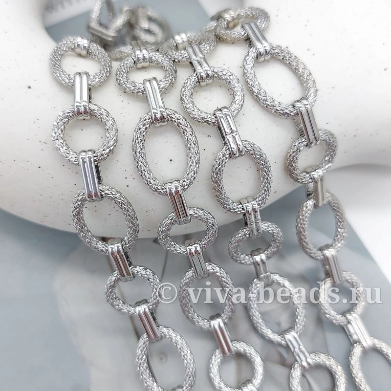 Цепь состоит из чередующихся овальных рельефных звеньев с легкой "плетеной" структурой и гладких перемычек. Родиевое покрытие придаёт изделию утончённый зеркальный блеск, стойкость к потускнению и премиальный вид. Хорошо держит форму и не перегружает конструкцию. Подходит как для центральных акцентов, так и для сборки многокомпонентных украшений.