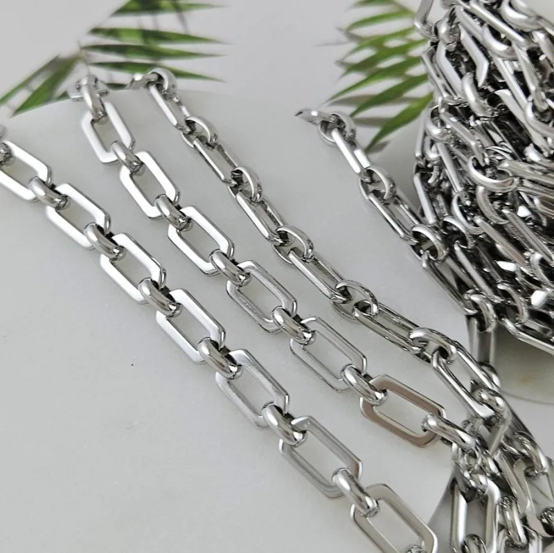 Цепь выполнена в минималистичном стиле: аккуратные овальные звенья создают ритмичный узор, а родиевое покрытие придаёт холодный металлический блеск. Компактный размер звеньев делает цепь подходящей для браслетов, чокеров, ожерелий и декоративных элементов.
