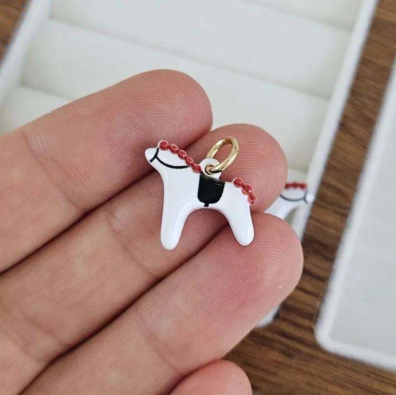 Изящная подвеска в форме белой лошади из нержавеющей стали с покрытием белой эмалью. Размер 14,6×13,5×4,7 мм. Чёткий силуэт и гладкая эмаль придают украшению благородство и универсальность — она одинаково хороша в детских, романтичных и этнических дизайнах. В комплекте идёт соединительное кольцо в позолоте 18К, позволяющее легко крепить подвеску к цепочке, шнуру или браслету.