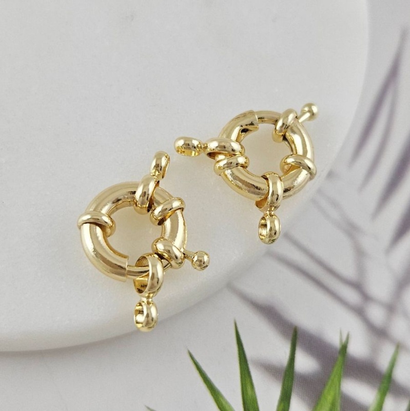 Замок выполнен в виде объёмного круга с декоративными "ручками", повторяющими форму морского штурвала. Гладкая блестящая поверхность позолоты создаёт презентабельный и дорогой вид. Деталь привлекает внимание и может использоваться как центральный акцент в украшении.