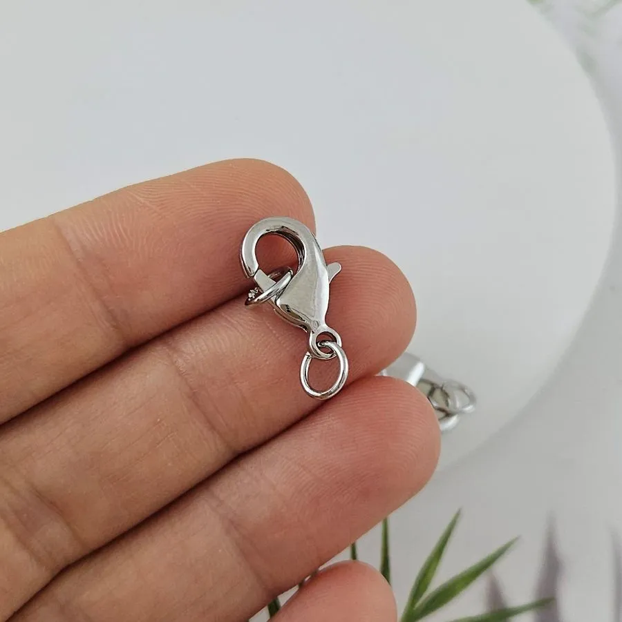 Классический замок лобстер длиной 15 мм с родиевым покрытием — универсальный и надёжный элемент фурнитуры для создания браслетов, цепочек, ожерелий, кулонов и прочих аксессуаров. Замок изготовлен из латуни и покрыт блестящим слоем родия, который защищает от потускнения, коррозии и придаёт украшениям элегантный серебристый блеск.