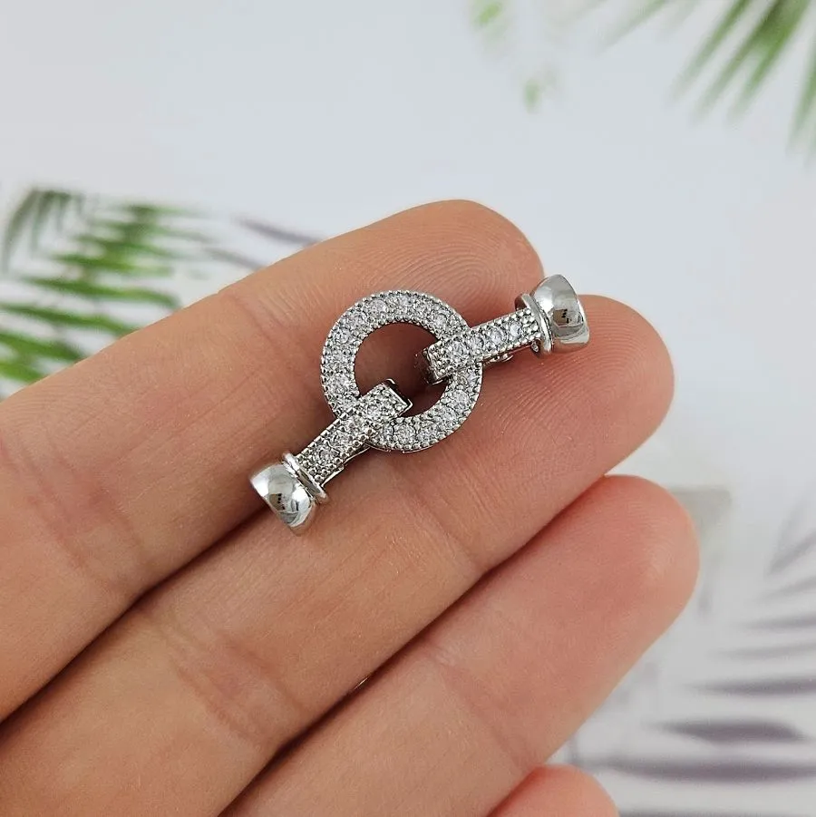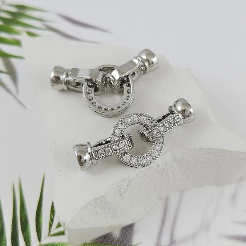 Элегантный замок с карабинами — изысканное и функциональное решение для создания браслетов и ожерелий премиум-класса. Центральное кольцо, усыпанное сверкающими фианитами, в сочетании с зеркальным родиевым покрытием создаёт нарядный и благородный акцент. Выполнен из латуни — прочного и износостойкого материала.