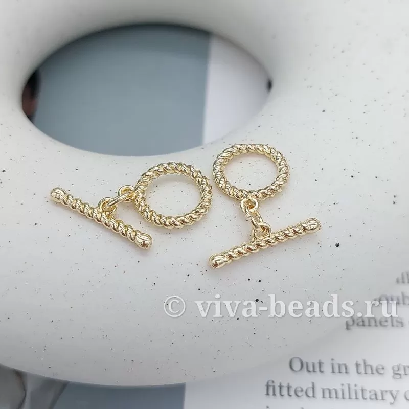 Витой замок-тоггл из латуни с покрытием позолотой 14К — стильное и надёжное решение для браслетов и колье. Состоит из круглого колечка диаметром 12 мм с витой текстурой и палочки длиной 18 мм. Рельефная поверхность создаёт игру света и тени, превращая застёжку в выразительный декоративный элемент.