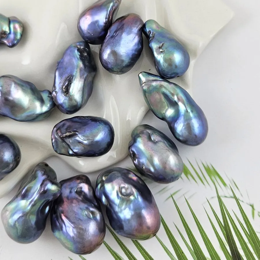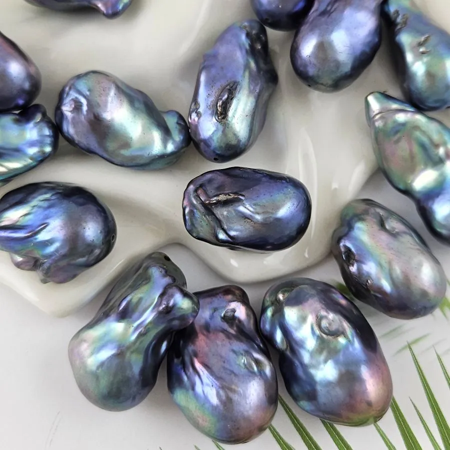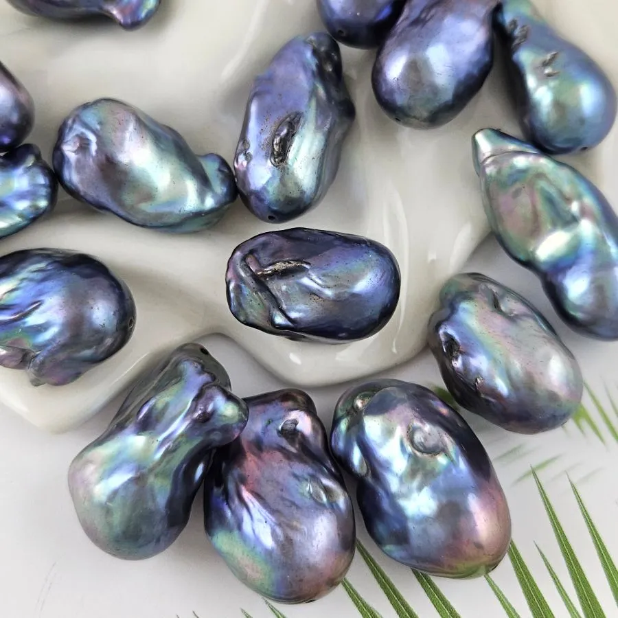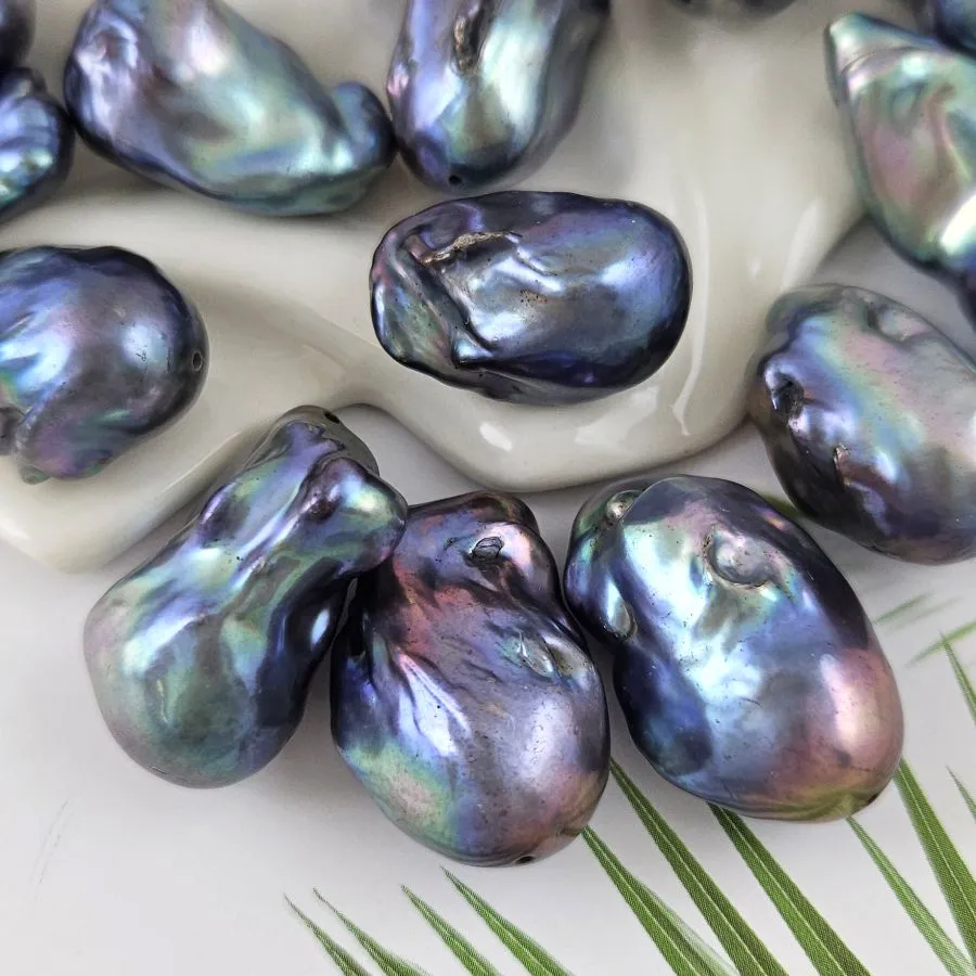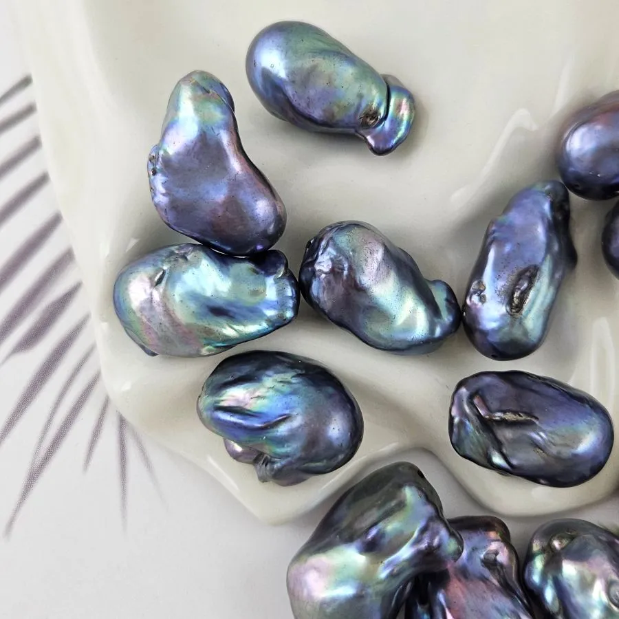 Этот жемчуг обладает насыщенным тёмным покрытием c переливами сине-фиолетового, зелёного, бронзового и серого оттенков. Искристый перламутровый блеск, естественные складки, изгибы и «архитектура» поверхности создают эффект уникального минерала с художественным характером.