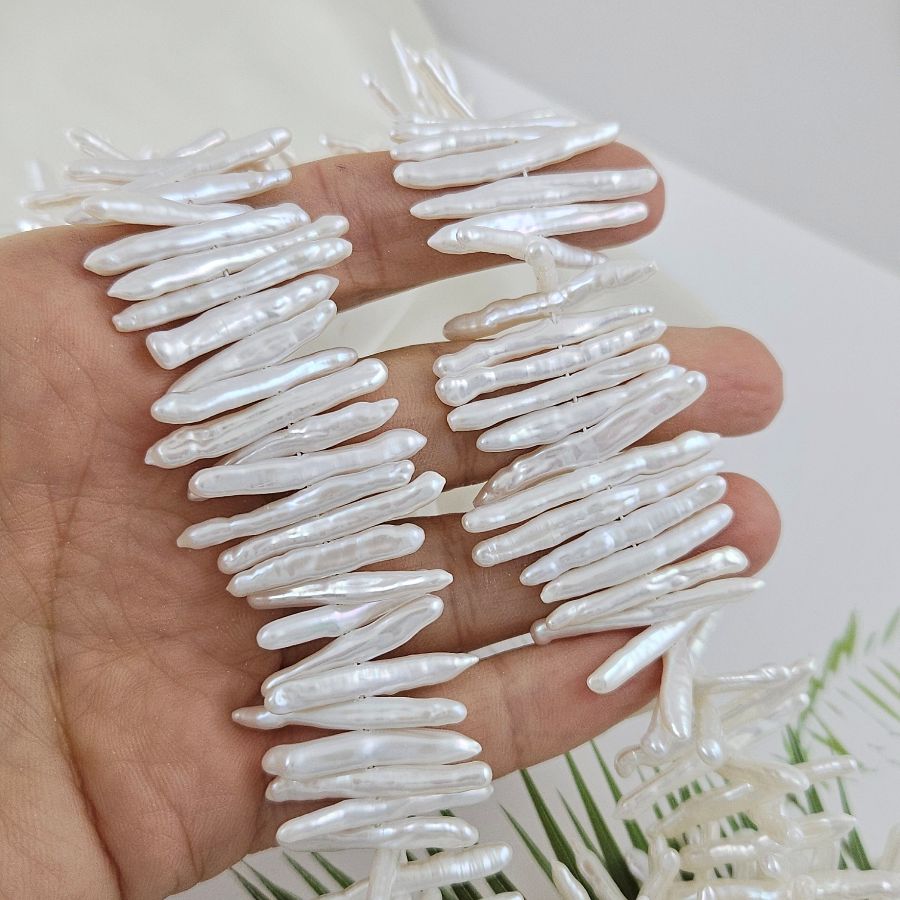 Удлинённая барочная форма напоминает изящные жемчужные иглы, гладкие и слегка волнистые. Блестящая поверхность белого цвета переливается живыми радужными бликами, красиво играя на свету. Благодаря неповторимым очертаниям, каждая "палочка" уникальна.