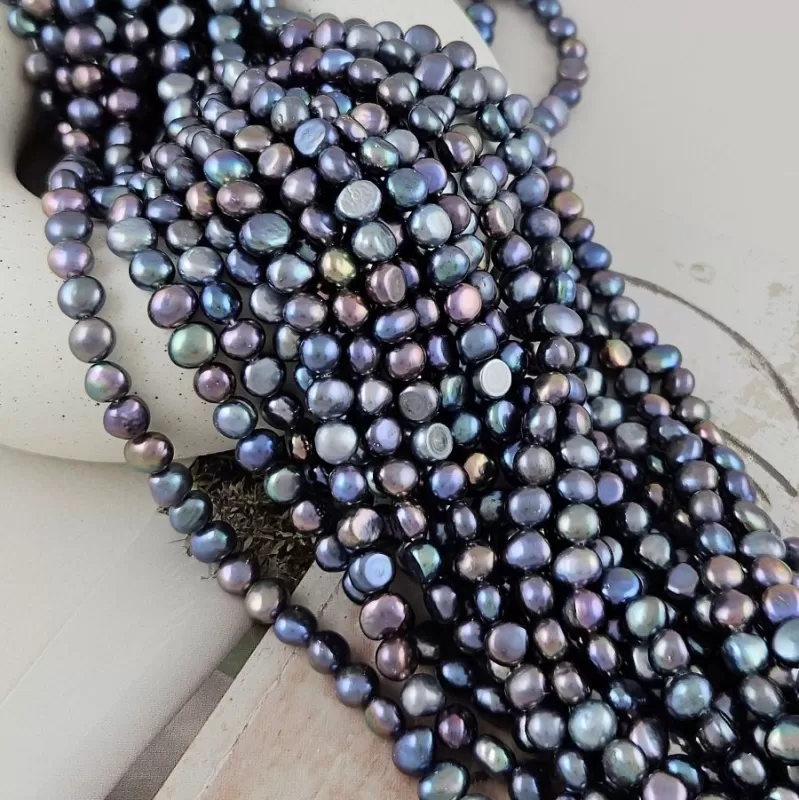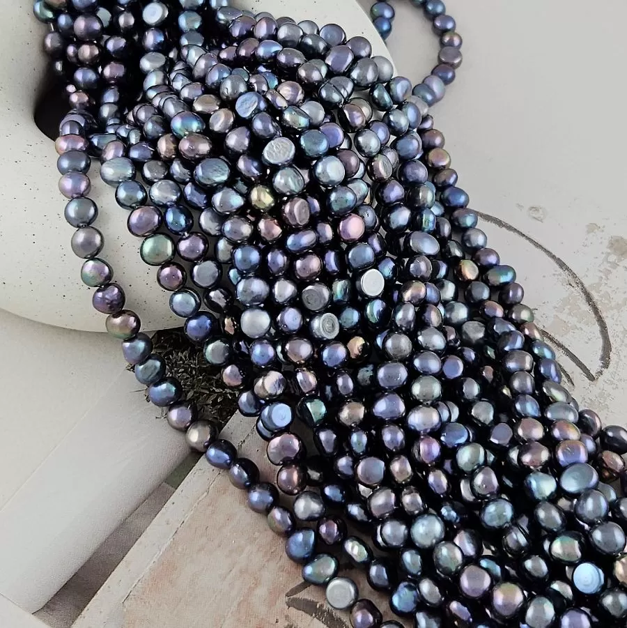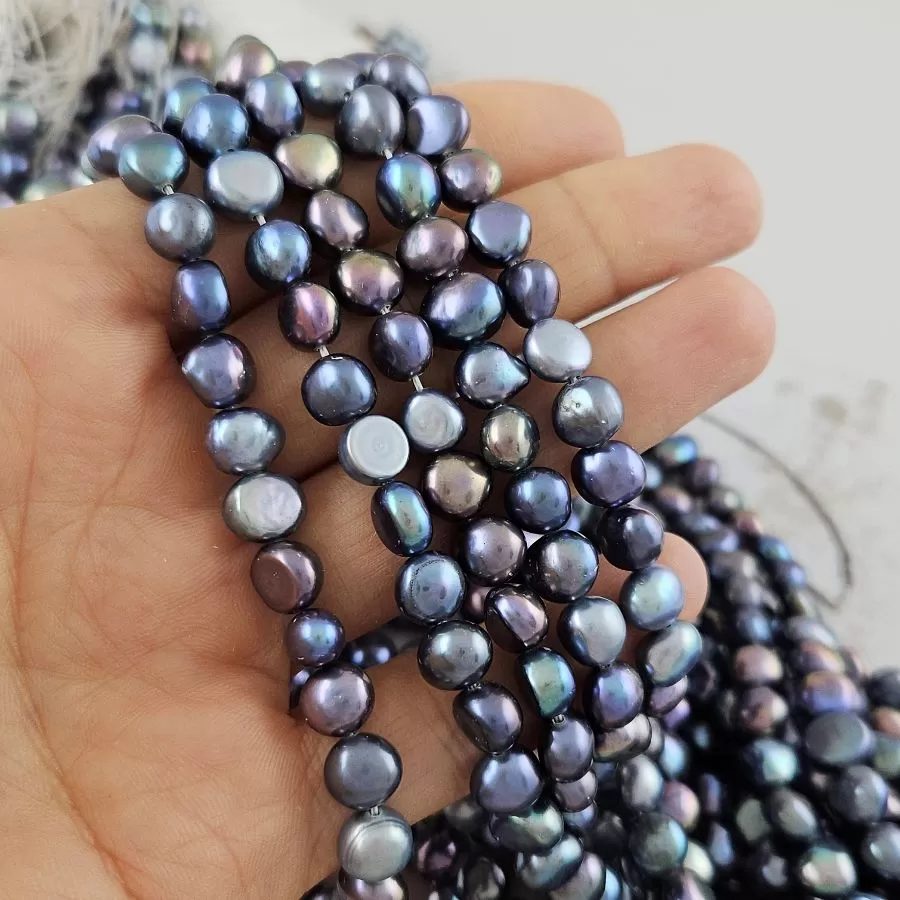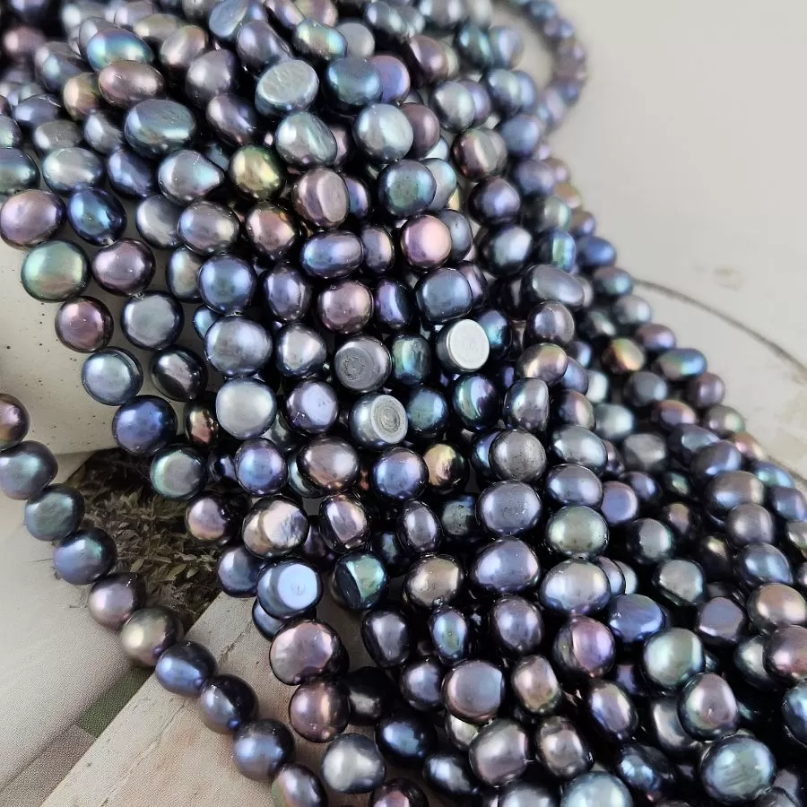 Нить натурального жемчуга барочной формы с насыщенным и загадочным переливом в редком оттенке "тёмный павлин" — глубокий тёмно-серый с радужными акцентами синего, фиолетового, зелёного и бронзового тонов. Размер бусин варьируется от 7–8 мм по толщине, 5–5.5 мм по ширине и 6.5–7 мм по высоте, форма — органичная барокко, каждая бусина уникальна. Оригинальный выбор для эффектных и нестандартных украшений.